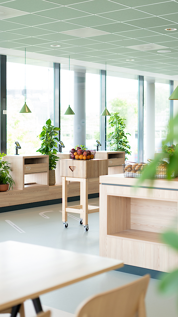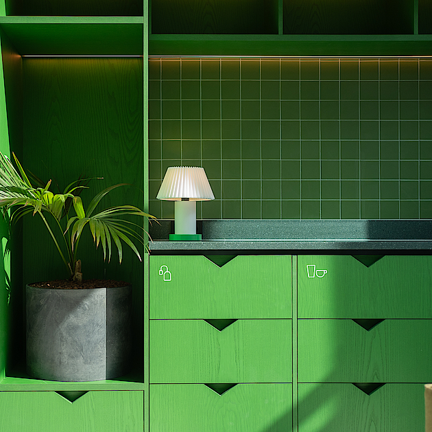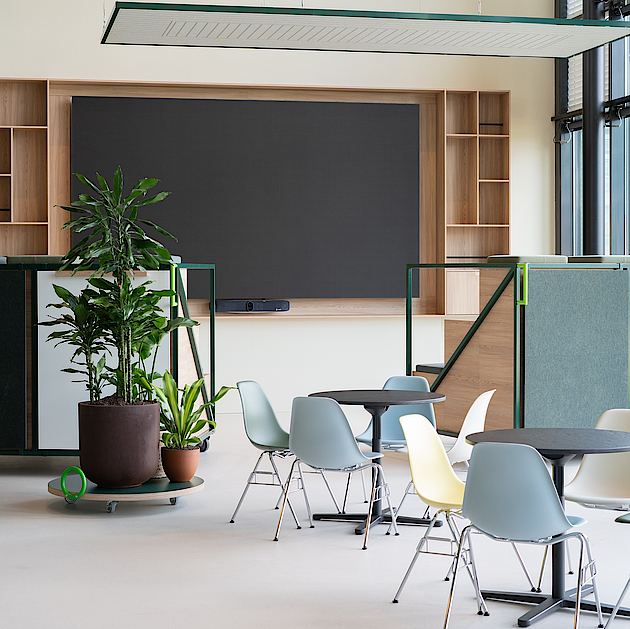 Almost every piece of furniture is on wheels. That makes it possible to rearrange the space over and over again - from a workspace in the morning to a place for drinks or a presentation at the end of the day. The acoustics, lighting and sight lines are tailored to that versatility.
