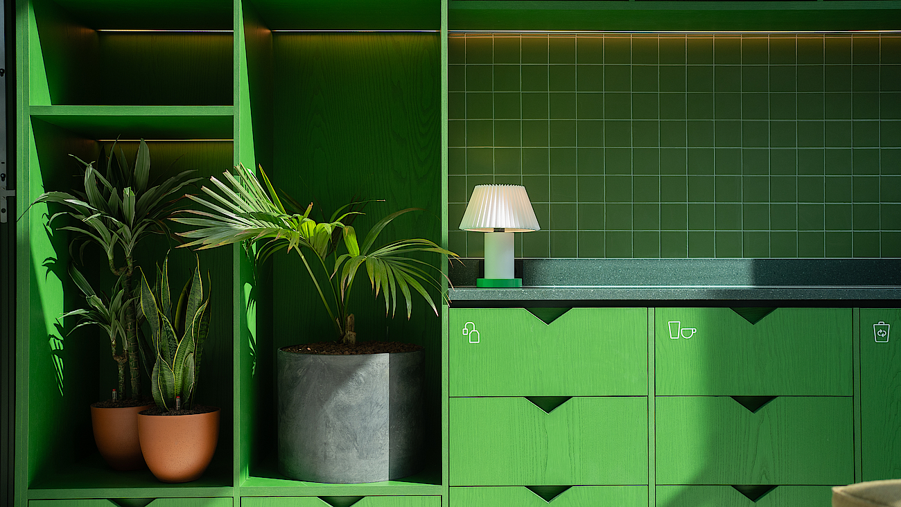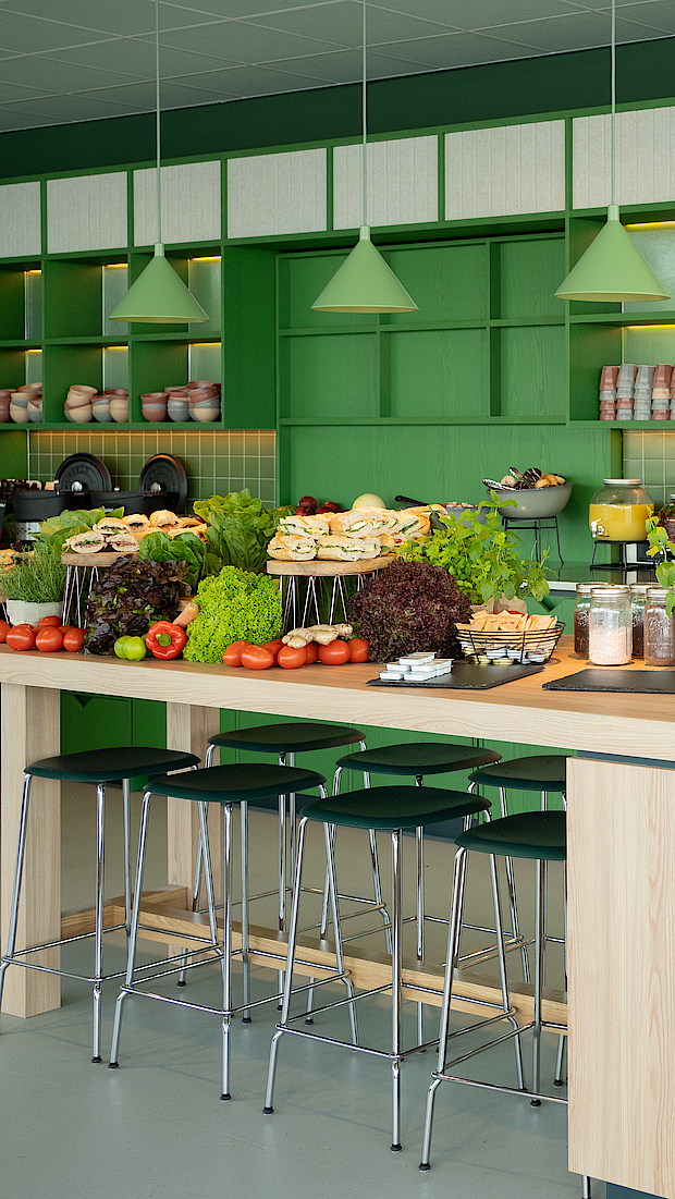 The design divides the space into two areas: the dining room and the living room. This layout makes the large space feel smaller and more human. The dining room is airy, open and practical - ideal for lunch or informal work. In the living room, the atmosphere is more intimate, with more textiles, warm lighting and seating at different levels. The large green element in the center acts as a visual fireplace and as a presentation stage.