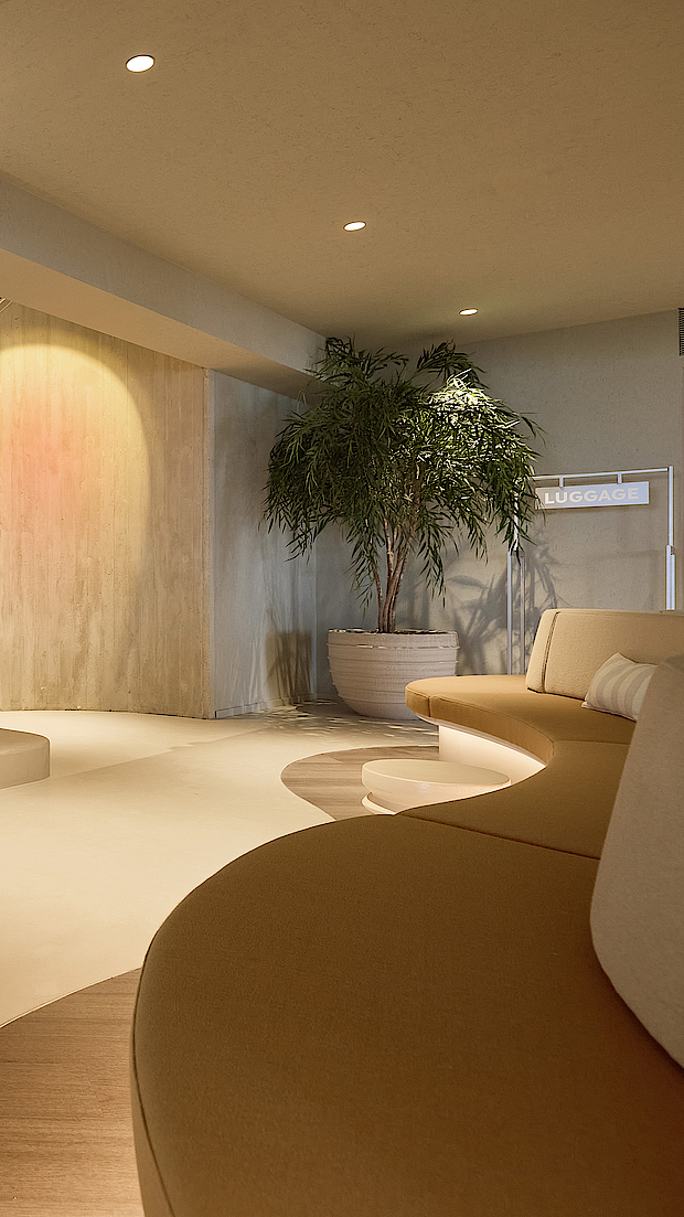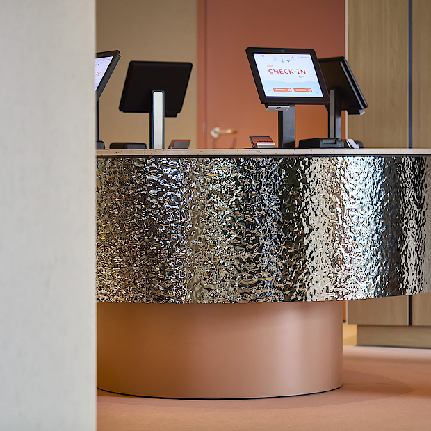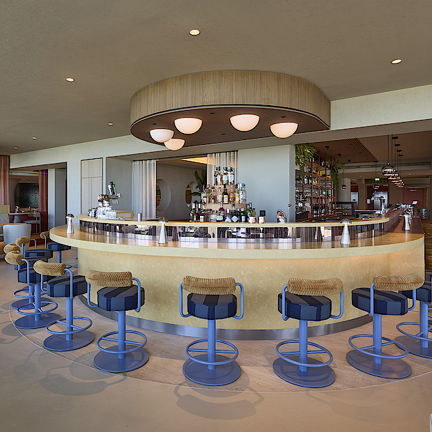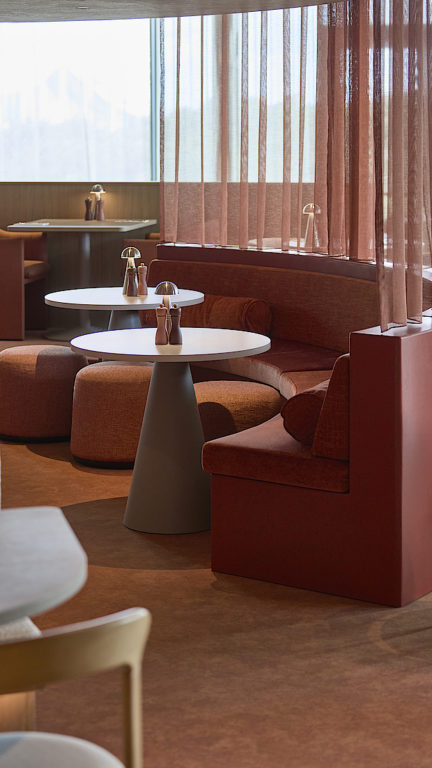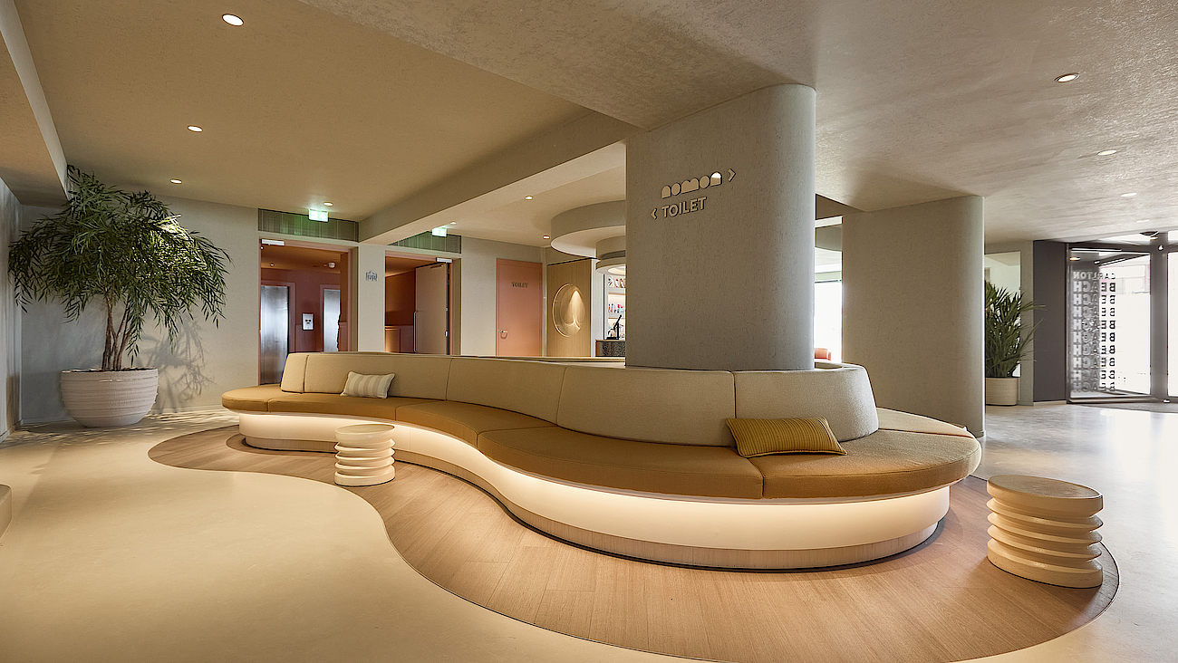 Van de zelf-incheckbalie met spiegelplaat en gebogen lijnen tot het ovale barmeubel met geïntegreerde verlichting: nagenoeg elk vast meubel is op maat gemaakt. Ook in het plafond kwamen de ronde vormen terug – met verlichting en luchtcirculatie subtiel geïntegreerd, zodat het er strak uitziet en onderhoud makkelijk blijft.
