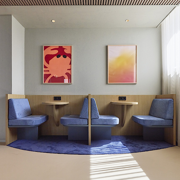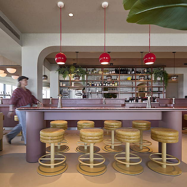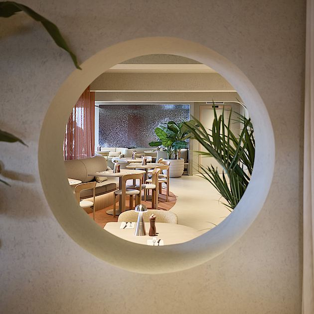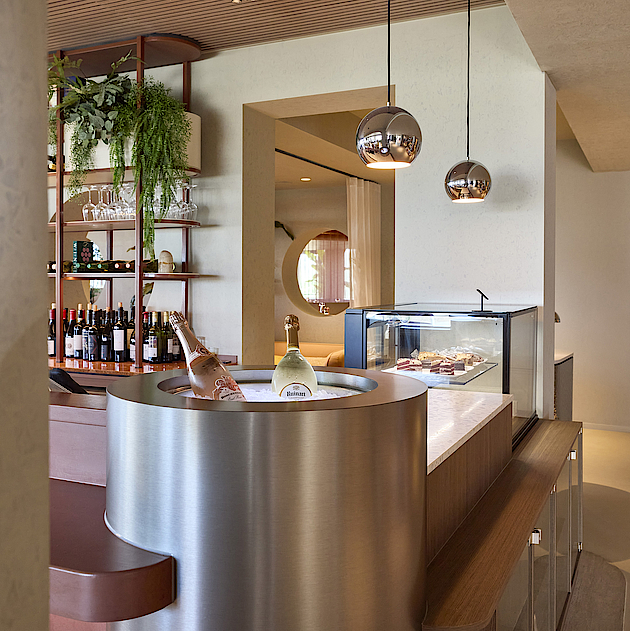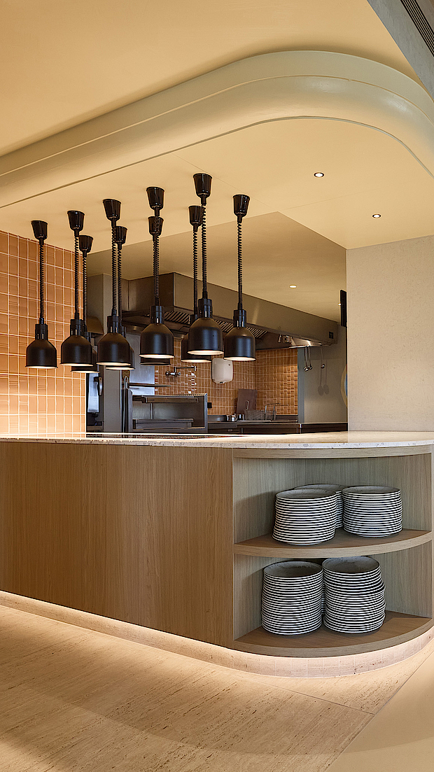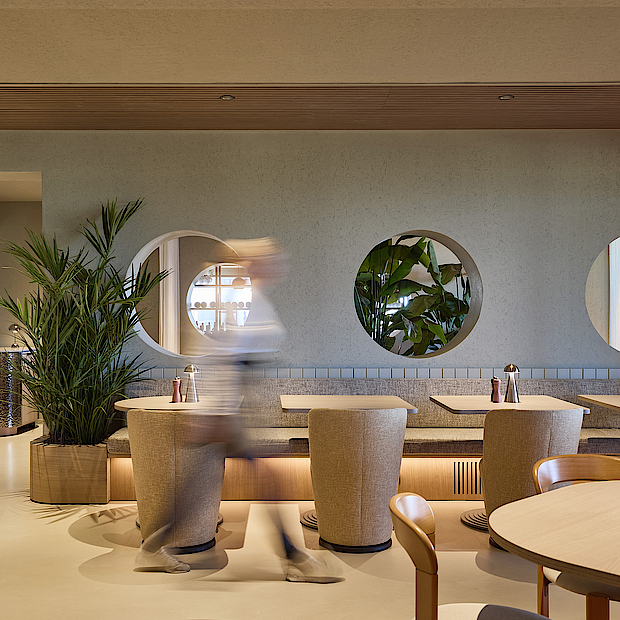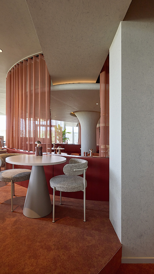 Van de zelf-incheckbalie met spiegelplaat en gebogen lijnen tot het ovale barmeubel met geïntegreerde verlichting: nagenoeg elk vast meubel is op maat gemaakt. Ook in het plafond kwamen de ronde vormen terug – met verlichting en luchtcirculatie subtiel geïntegreerd, zodat het er strak uitziet en onderhoud makkelijk blijft.