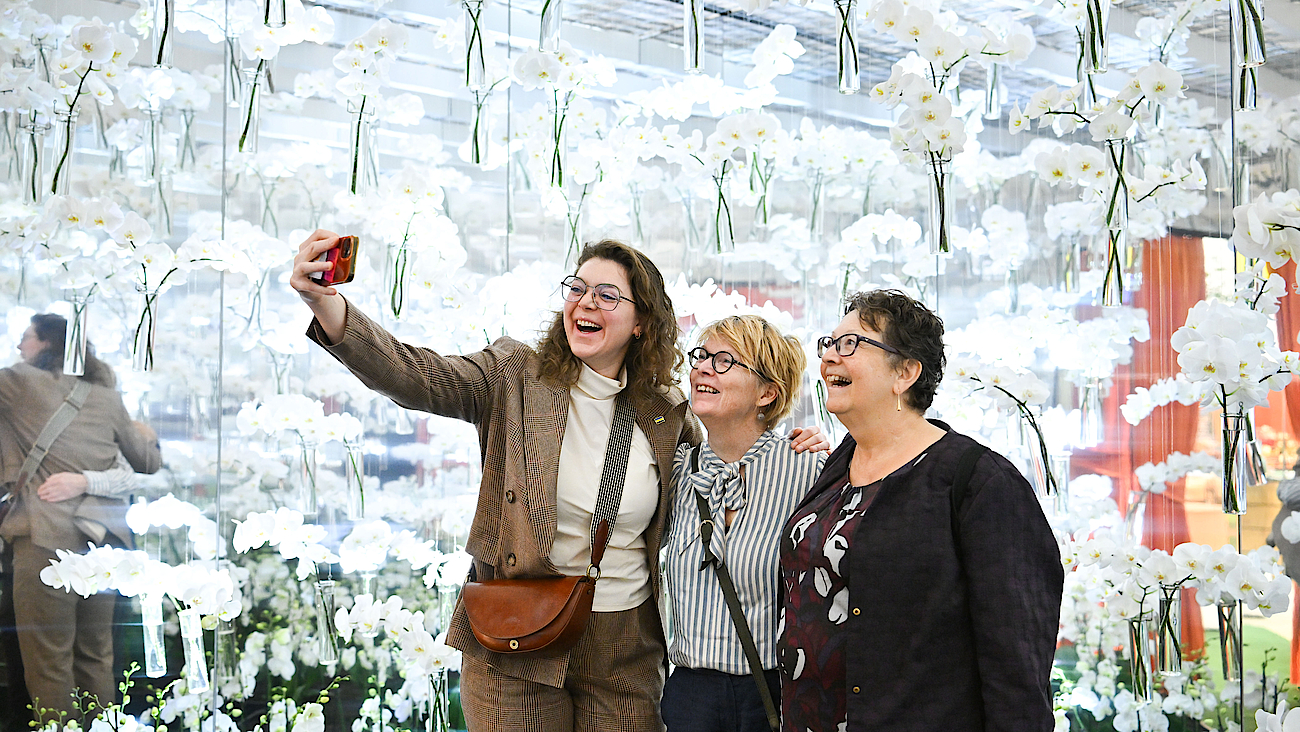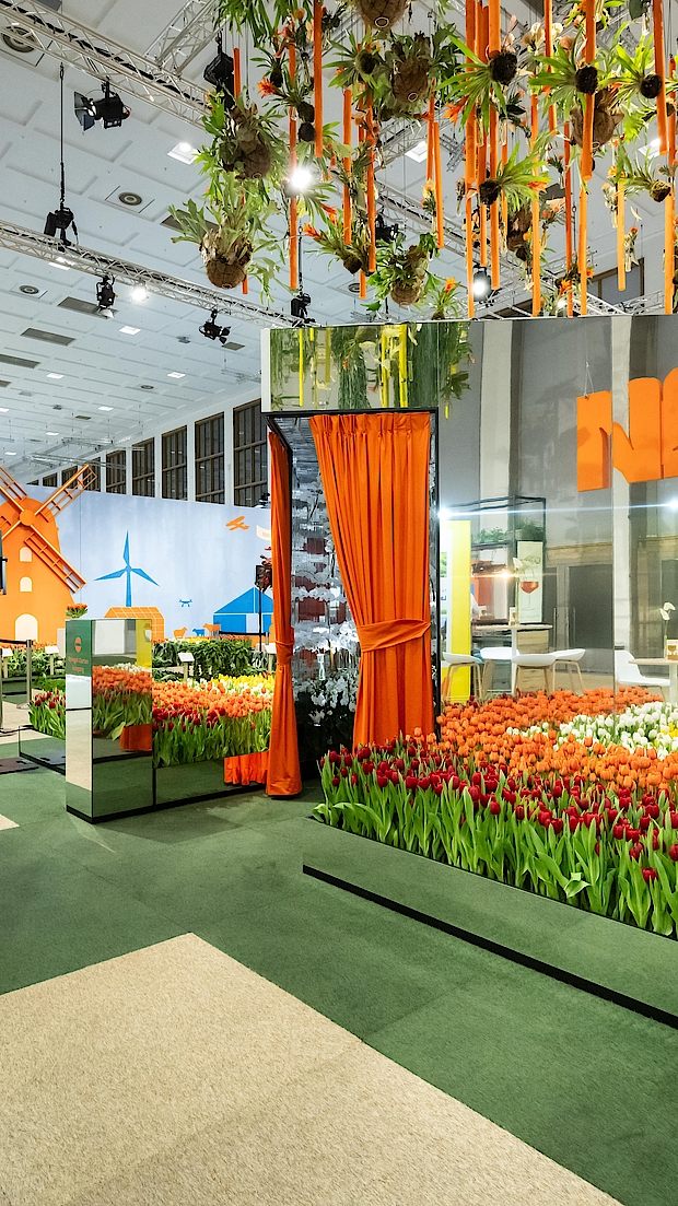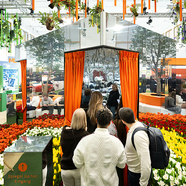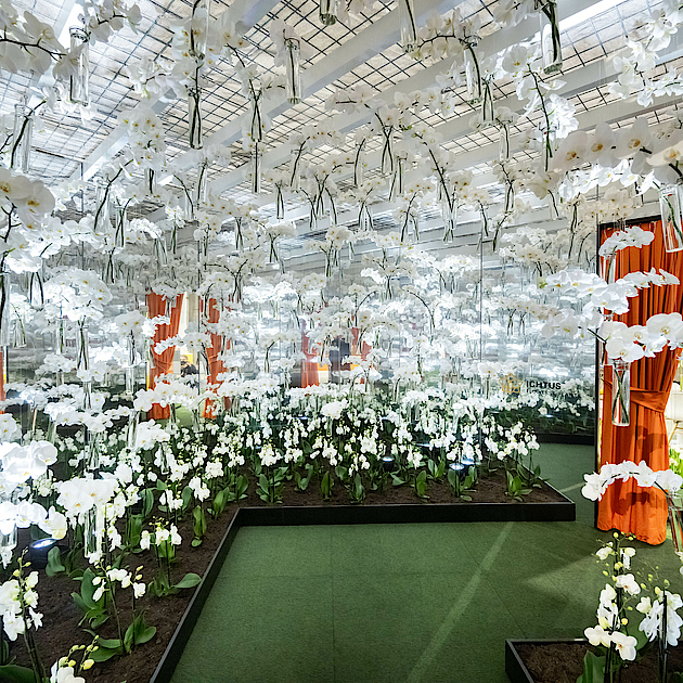 In het hart van het plein stond de Spiegel Garten: een spiegelkubus met meer dan 2.000 witte orchideeën. Door reflectie leek de bloemenzee oneindig. Bezoekers stapten letterlijk het verhaal binnen en vonden midden in de drukte een moment van verwondering. De installatie werd de meest gefotografeerde plek van het paviljoen en gaf het 100-jarige jubileum van de beurs een eigen gezicht.