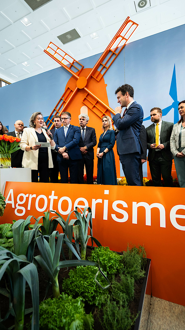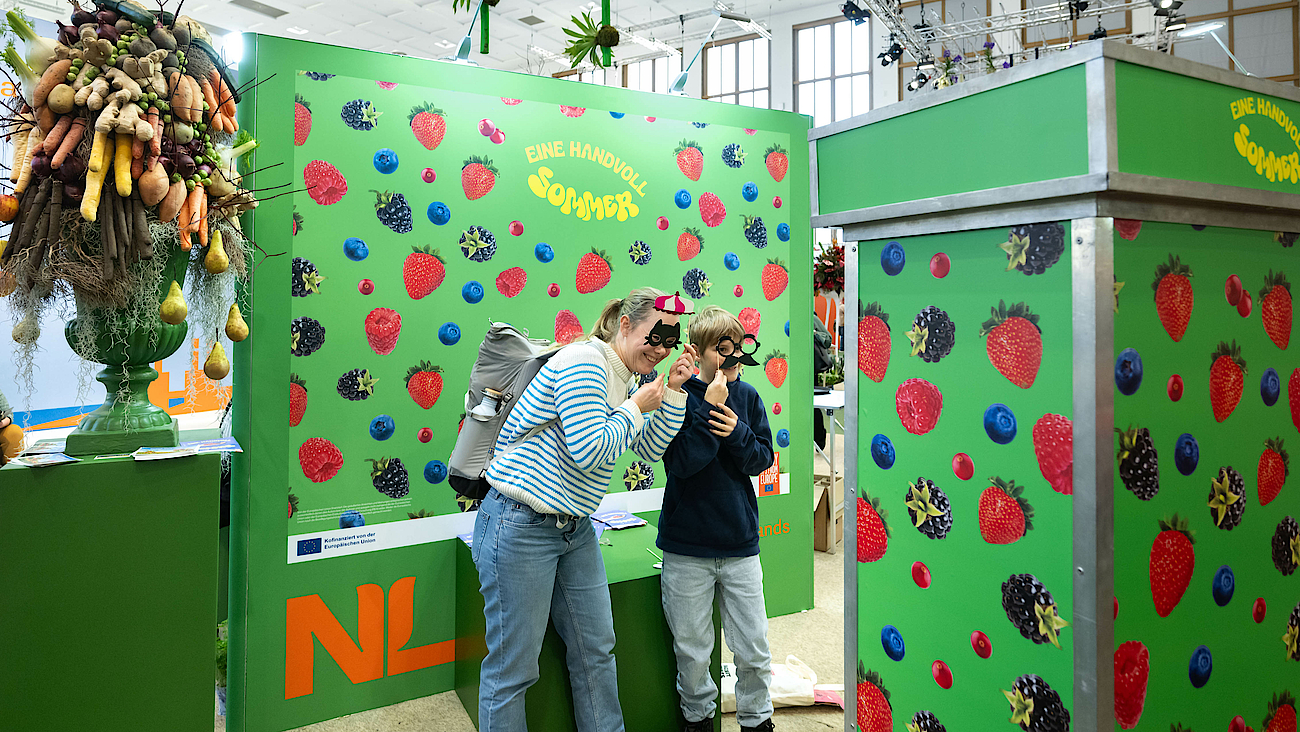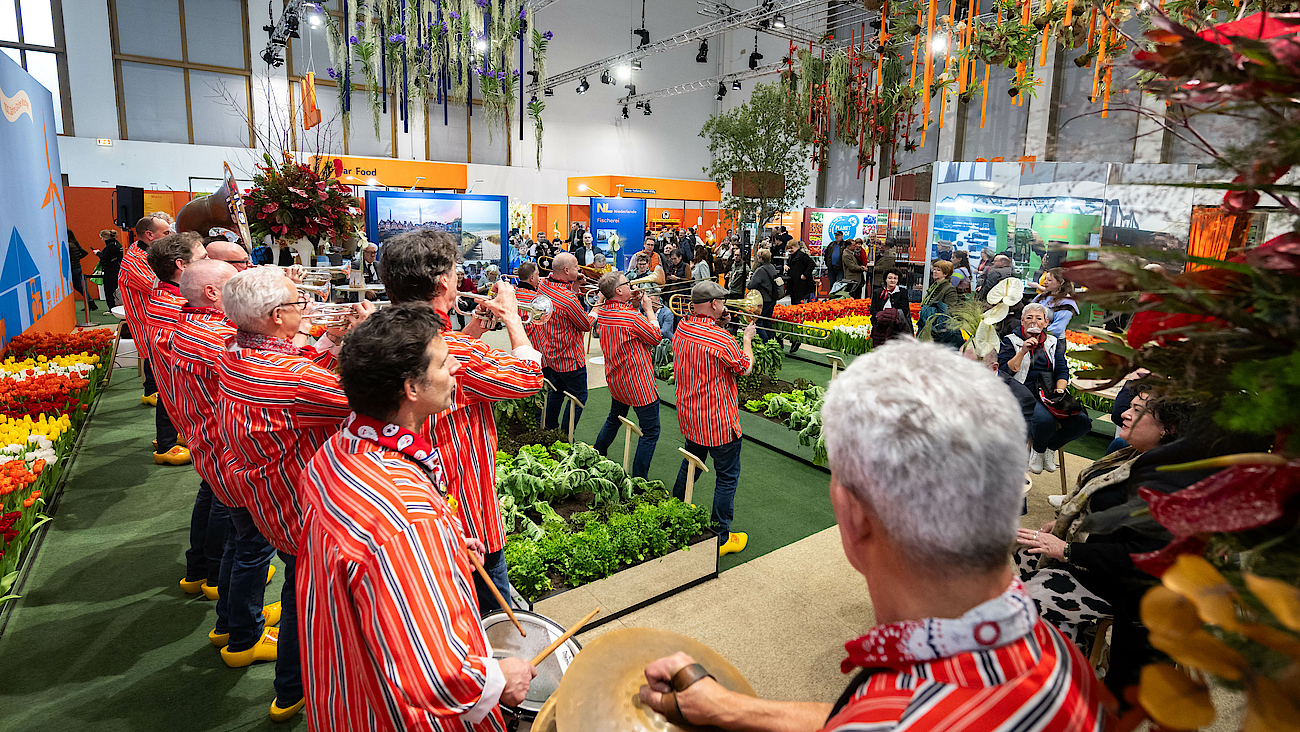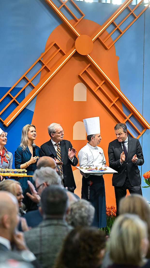 Het paviljoen werd ontworpen als één open marktplein. Hier kruisten werelden elkaar: de Nederlandse en Duitse minister doopten er de jubileumtulp ‘Tulipa Berlin Jubilee’, terwijl verderop Kleintje Pils speelde en Duitse gezinnen kaas proefden. Verspreid over het paviljoen nodigden fotomomenten en activaties uit tot meedoen. Bezoekers keken, luisterden, proefden en deden mee.