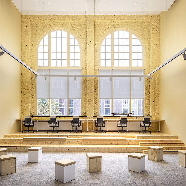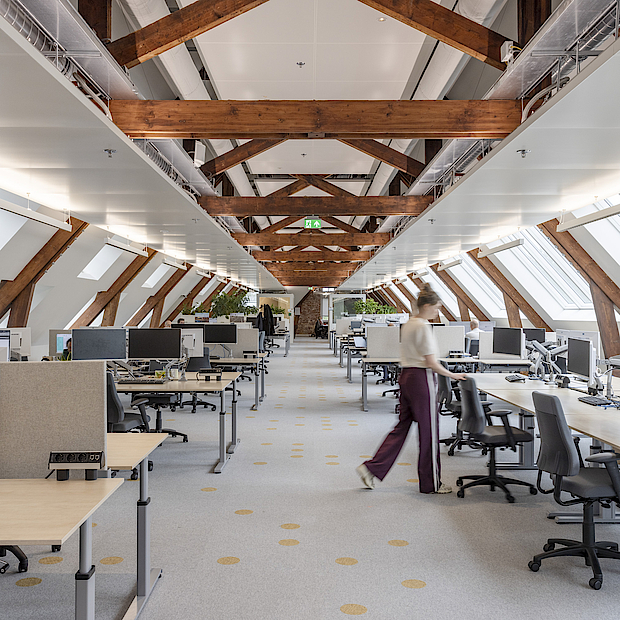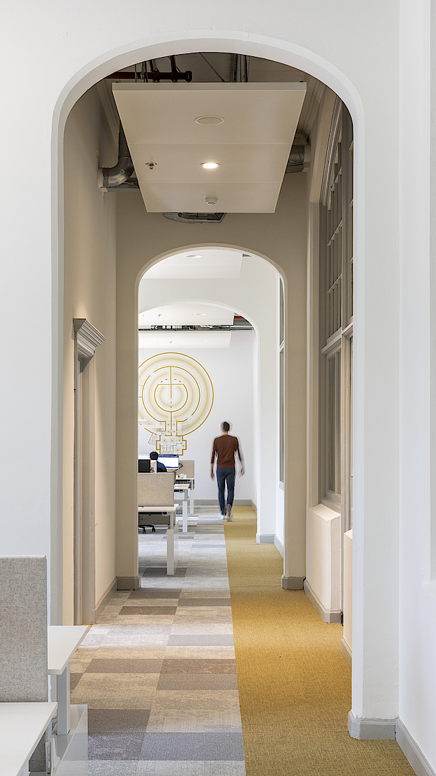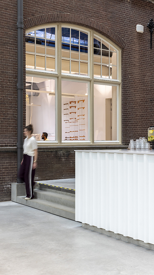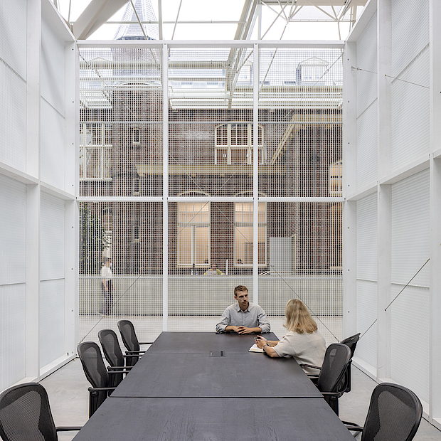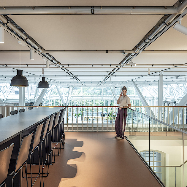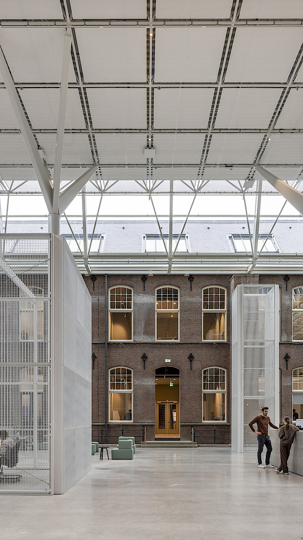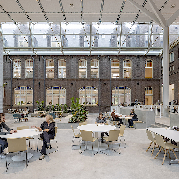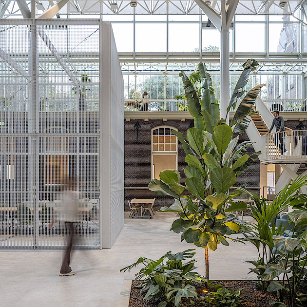 - Visuele impact: Medewerkers profiteren van de indrukwekkende ‘Follies’ in de atria. Deze zes meter hoge, semi-transparante overlegstructuren geven het kantoor een unieke uitstraling.